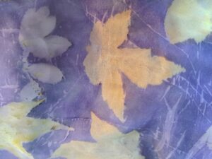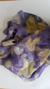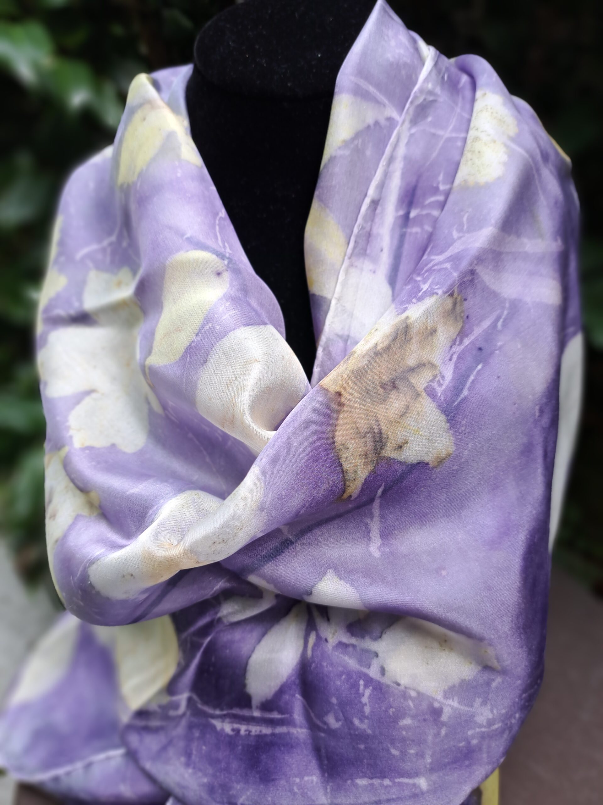 Pongee zijden sjaal met ecoprint. Ik heb o.a. Esdoorn, braamblad en eikenblad gebruikt. De achtergrond is gekleurd met Blauwhout, een boomschors uit Zuid-Amerika.